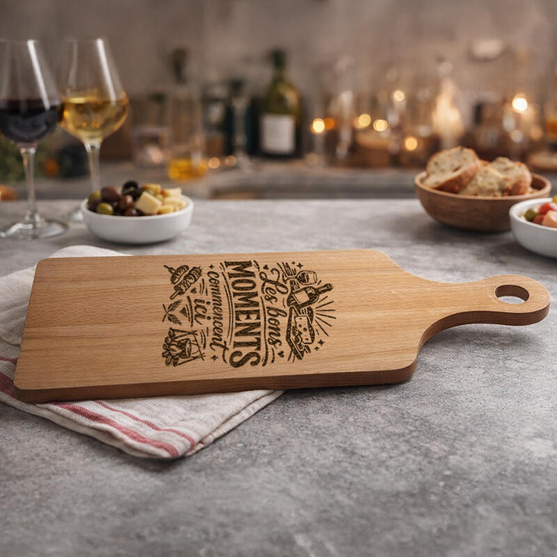 Présentation du produit : Découvrez notre planche à découper en bois, gravée avec le message ‘Les bons moments commencent ici’. Un accessoire chic pour votre cuisine, elle apporte une touche personnelle à vos préparations culinaires.