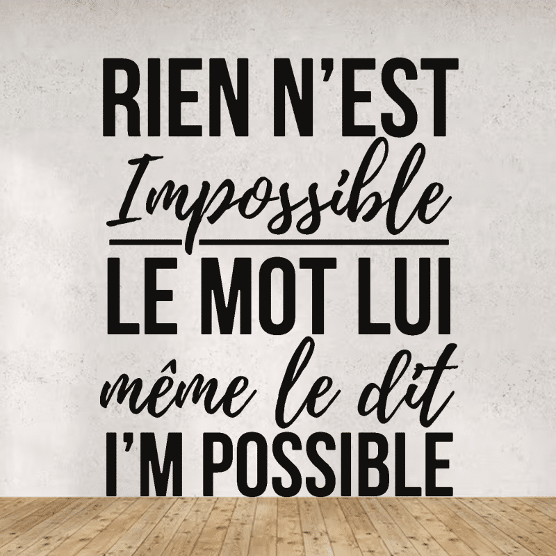 Transformez votre espace avec notre sticker vinyle inspirant ‘Rien n’est impossible’. Parfait pour le salon ou le séjour, ce sticker apportera une touche de motivation et de style à votre décoration intérieure. Facile à appliquer, il s’adapte à tous les types de surfaces lisses. Osez l’impossible et personnalisez votre maison avec ce message motivant !